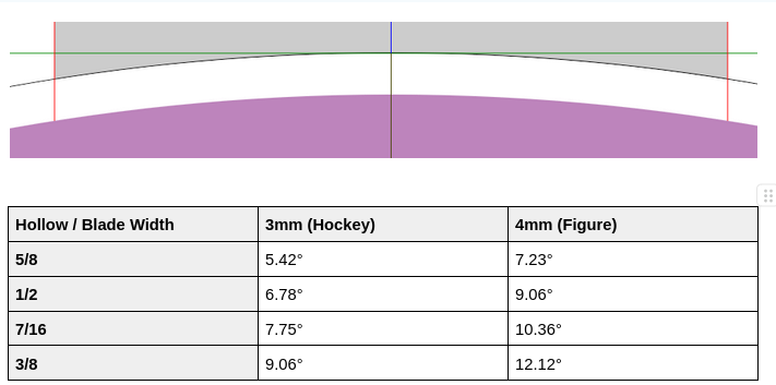 See the table below to convert the hollow radius, along with the width of the blade, to the angle of the edge against the ice. This doesn’t really provide any practical purpose, other than to illustrate that as you get deeper, you typically need smaller adjustments of radius to maintain a consistent difference between the angle. This is the primary reason we don’t normally use 9/16ths – the difference between that and 5/8ths is quite small, though some people still ask for it, and we’re happy to oblige.